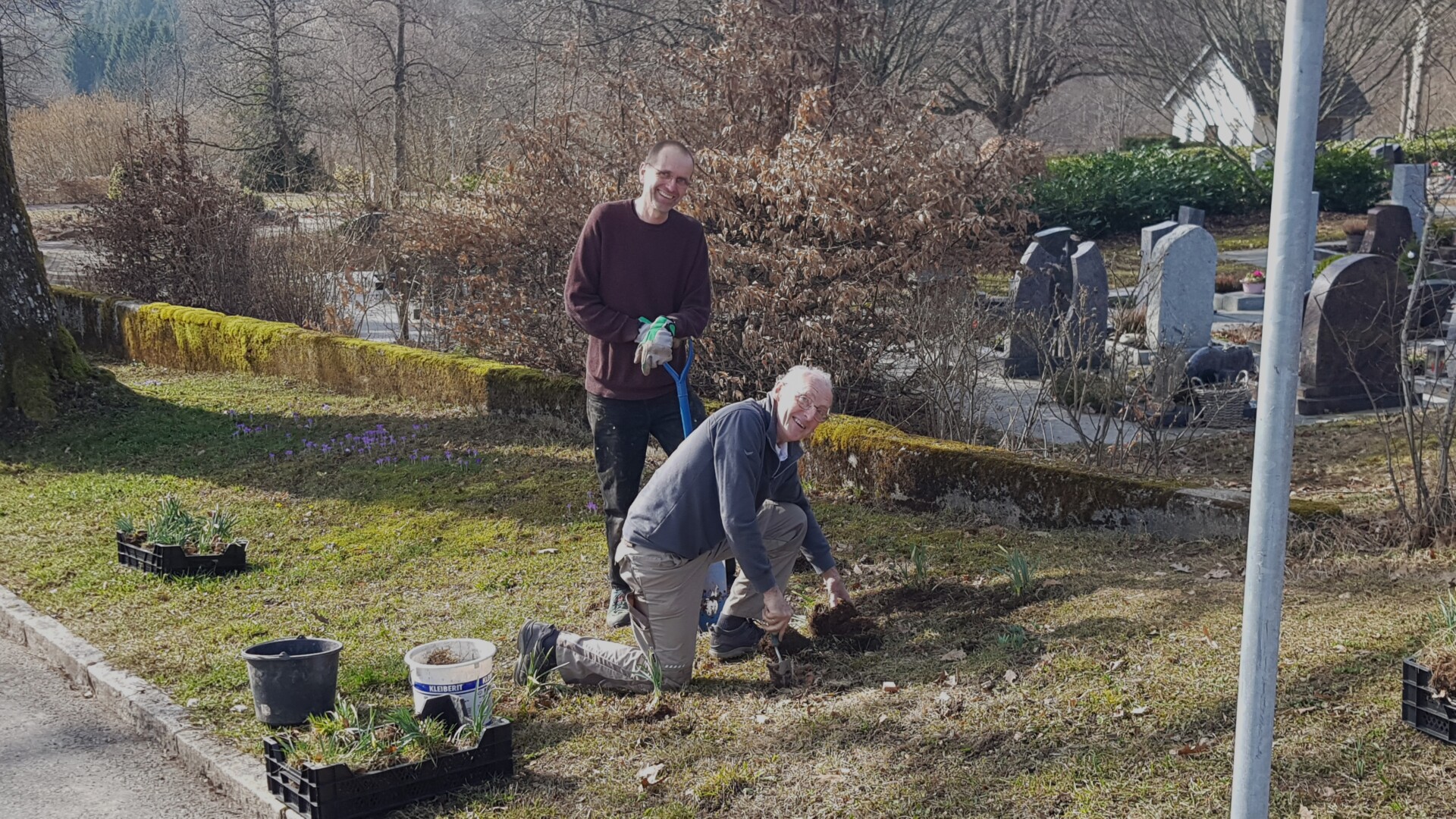 Aus dieser Geschichte ist der Transfer von Zwiebelpflanzen im Frühjahr für unser naturnahes, öffentliches Grün geworden. Wir haben nun den oberen Teil unseres Beetes „Unter den Linden“ am Friedhof mit ca. 300 Narzissen bepflanzen dürfen. Natürlich mit Erlaubnis der Besitzer. Das Tolle, diese Pflanzen blühen noch im gleichen Jahr, so etwas gibt es nicht im Handel – echte Wild-Narzissen, die in Deutschland noch vorkommen (Nationalpark Eifel und im Hunsrück).