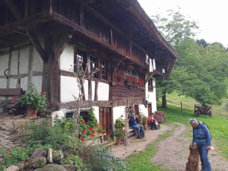 Da wir etwas früher als geplant ankamen, genossen wir auf dem „Hausbänkle“ die Sonne, den Blick über die Wiesen und die Atmosphäre des alten Hofs.