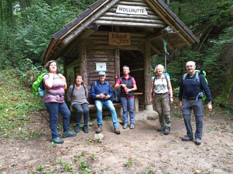 Über Weidwiesen mit Ausblicken auf Burg Rotberg und die Basler Skyline ging es bis zum Einstieg in die Chälengrabenschlucht. Erfreut stellten wir fest, dass wir auch in der Schweiz der vertrauten gelbe Raute folgen konnten. Zwischen steilen Felswänden führten uns Treppen, schmale Pfade und Brücken hoch Richtung Blauenpass. Nach einer Vesperpause auf einem schön gelegenen Grillplatz nahmen wir das letzte schweißtreibende Stück in Angriff. Eine kurze Verschnaufpause auf dem höchsten Punkt unserer Tour - und weiter ging es, aber diesmal bergab. Ein paar Regenwolken lieferten eine kleine Abkühlung und bald war auch schon wieder Mariastein erreicht. Helena, unsere Wanderführerin, erzählte uns die wundersame Legende von Maria im Stein, ehe wir in die Grotte hinabstiegen - vorbei an zahllosen Danksagungstafeln aus aller Welt. Ob einige von uns hier Maria ein Anliegen vortrugen - wer weiß? Nach der Besichtigung der barocken Wallfahrtskirche machten wir uns auf den Heimweg und schlossen den Tag mit einem gemütlichen Hock in der Wehrer Krone ab.